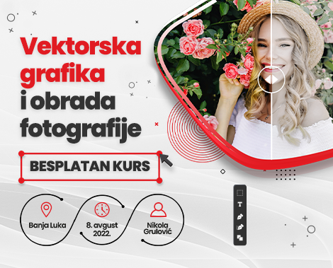 Besplatni kurs „Vektorska grafika i obrada fotografije” omogućit će vam da se na praktičan način upoznate sa programima Adobe Photoshop i Adobe Illustrator, kreirate unikatne projekte, otkrijete koja je razlika između dva najzastupljenija programa u kreiranju vizualnih rješenja, te odgonetnete najefikasniji način da ispoljite i unovčite svoju kreativnost!
